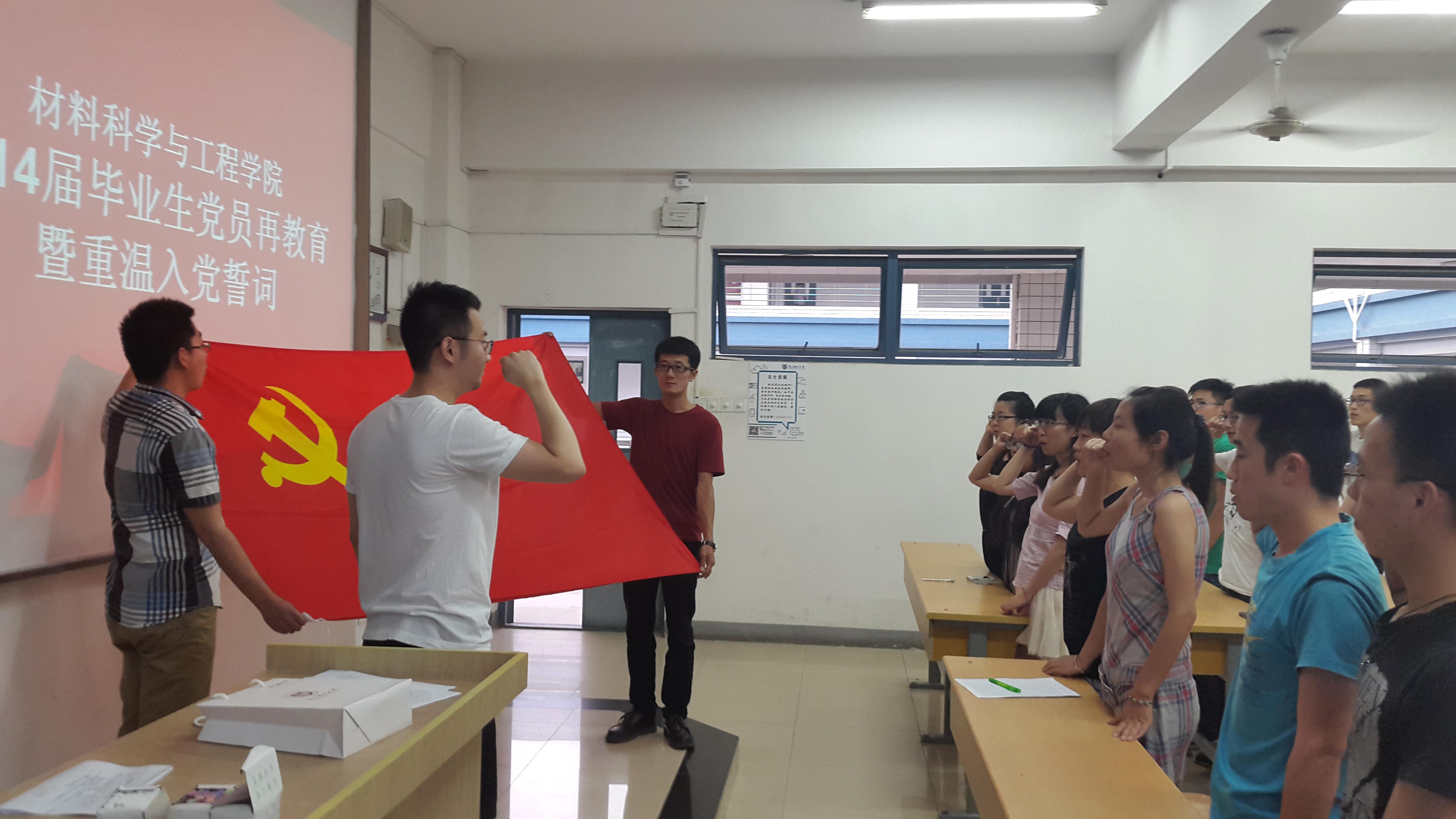 为了切实加强毕业生党员教育,提高毕业生党员的党性修养,激励毕业生党员在文明离校工作中充分发挥模范带头作用。6月10日,太阳城娱乐 在教3-404教室举行了2014届毕业生党员再教育暨重温入党誓词主题活动。参加人员有院党委副书记于景宝老师,院组织干事、2010级辅导员刘颖老师及2010级本科生支部全体党员。