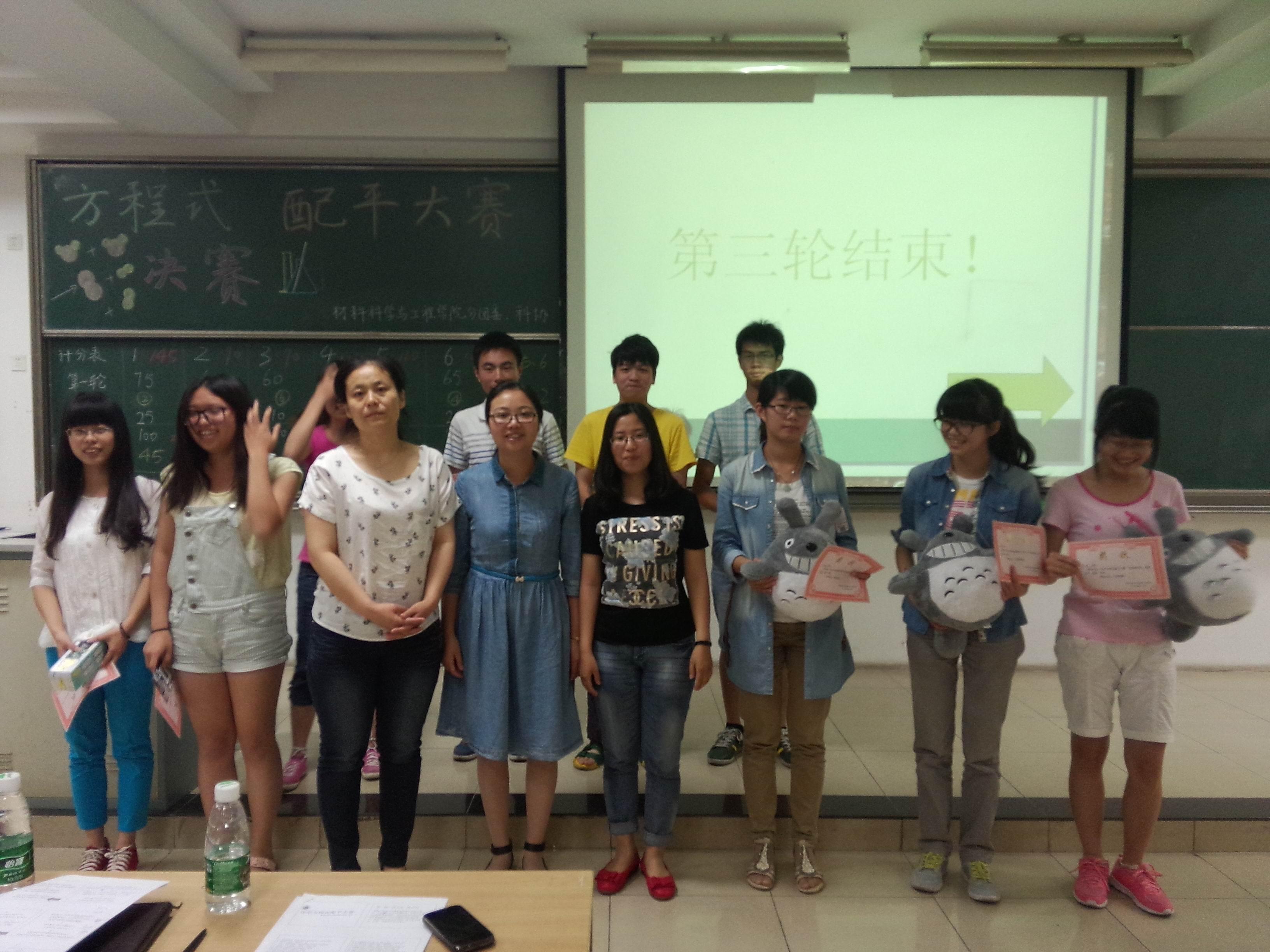 2014年6月5日晚,集知识性、趣味性于一体的“化学方程式配平大赛”决赛在教三402室成功举办。出席此次决赛的嘉宾有材料院分团委书记乔祖琴老师,材料院教师薛伟和郑超老师,以及材料院各个社团主席。此次比赛由太阳城娱乐 科协承办,旨在推广化学基础知识,提高学生团队合作能力,培养同学们的科学素养,使同学们在快乐中汲取知识,给全校对化学感兴趣的同学们一个展现自己的平台。