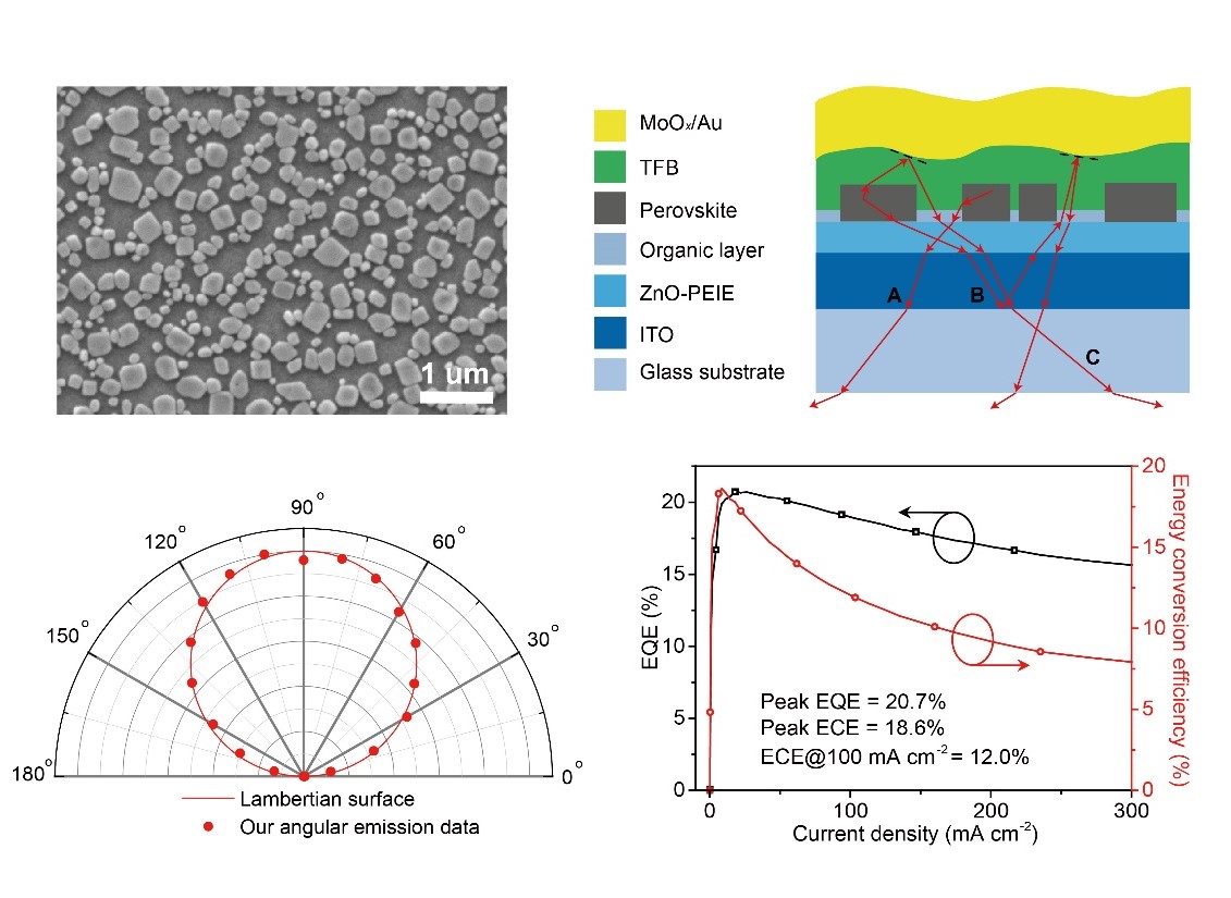 为突破这一世界性的重大科学难题,黄维院士和王建浦教授所带领的研究团队,通过一种简单的低温溶液法,实现了由一层非连续、不规则分布的钙钛矿晶粒和嵌入在钙钛矿晶粒之间的低折射率有机绝缘层组成的发光层,进而大幅度地提高了LED的光提取效率。据该研究主要负责人、南工先进材料研究院常务副院长王建浦教授介绍,使用该方法制备的LED器件外量子效率达到20.7%,在100 mA cm-2的电流密度下能量转化效率达到12%。此外,通过与浙江大学田鹤教授、戴道锌教授团队之间的合作,他们发现该方法形成的非周期性结构可以将LED光提取效率提高10个百分点。