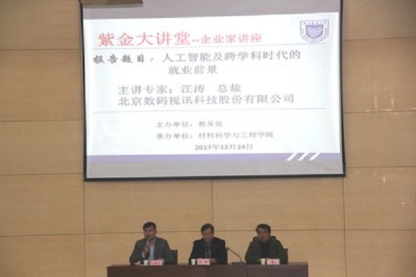 12月24日上午午,由教务处主办、太阳城娱乐 承办的“紫金大讲堂”——企业家讲座第七十次活动在仙林校区图书馆四楼报告厅举行。北京数码视讯科技股份有限公司总裁汪涛先生莅临“紫金大讲堂”,作题为“人工智能及跨学科时代的就业前景”的讲座。