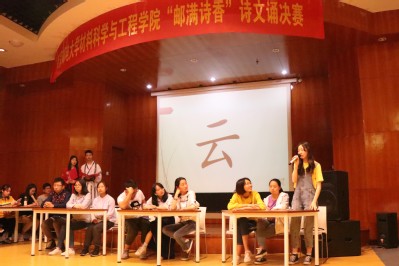 本届诗文诵分为初赛、复赛和决赛三个阶段。全校各个学院共有200多名同学报名参加比赛,经过初审选拔,有12组选手进入了复赛,在激烈的复赛比拼后,最终有10组选手脱颖而出,站到了决赛的舞台。本届诗词大会决赛题目类型多样,包括闻歌传花、诗词对答、飞花令等,分为必答题和抢答题,既提高了比赛的竞争性和观赏性,又让选手们充分展示了自己的文学功底。在决赛的对决中,各位选手你追我赶,分数排名变换不断,最终,来自17级材料物理专业的曹金英、袁亚楠、陈孝茹荣获冠军。