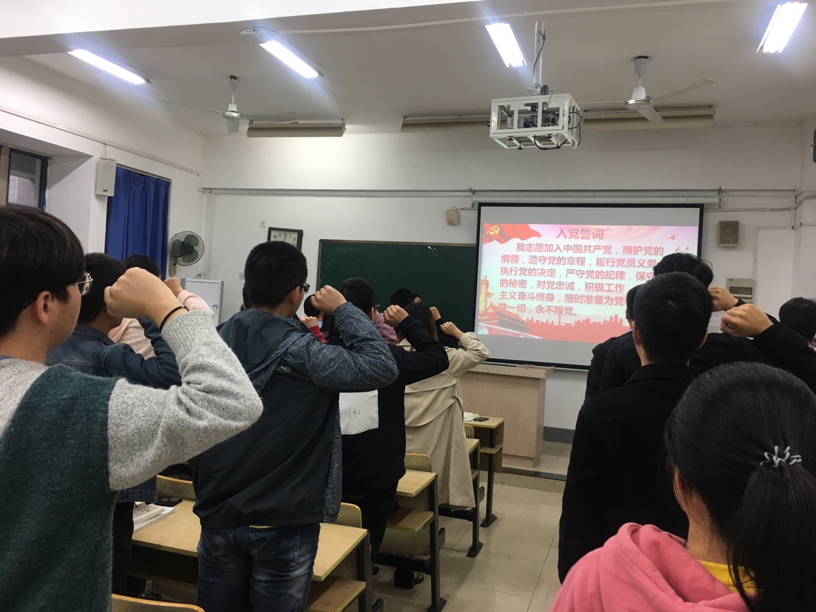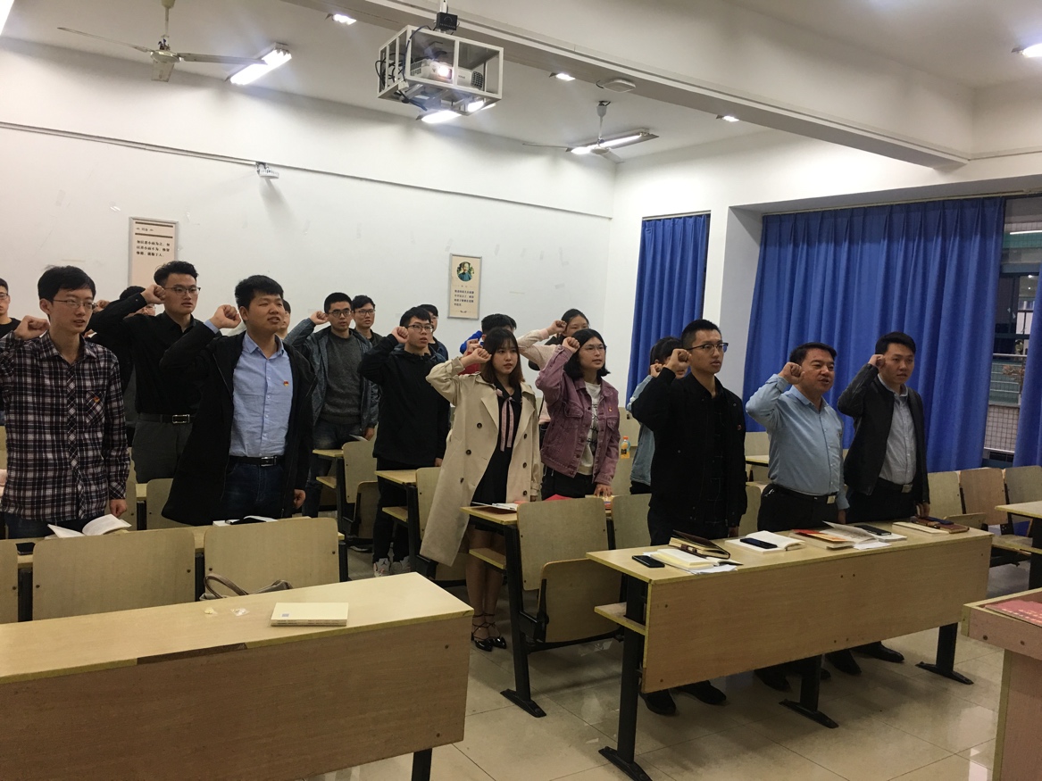 党课尾声,学工党支部全体党员重温入党誓词,“我志愿加入中国共产党”响彻全场。