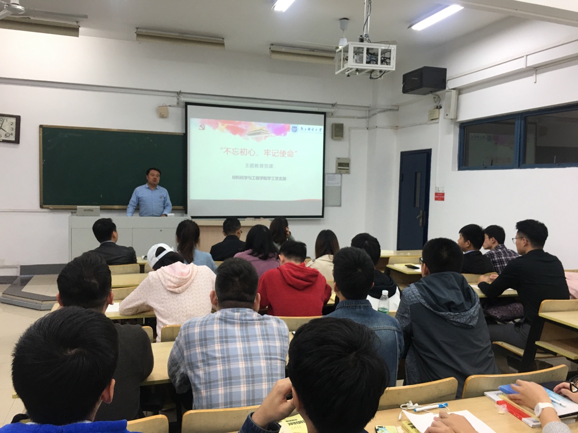 2019年10月23日下午,太阳城娱乐 学工党支部于教3-103教室组织了 “不忘初心、牢记使命”主题党课,由学院于景宝副书记讲授。辅导员杨书丹、赵赫男、陈骏与本科学生党员一起参加党课学习。