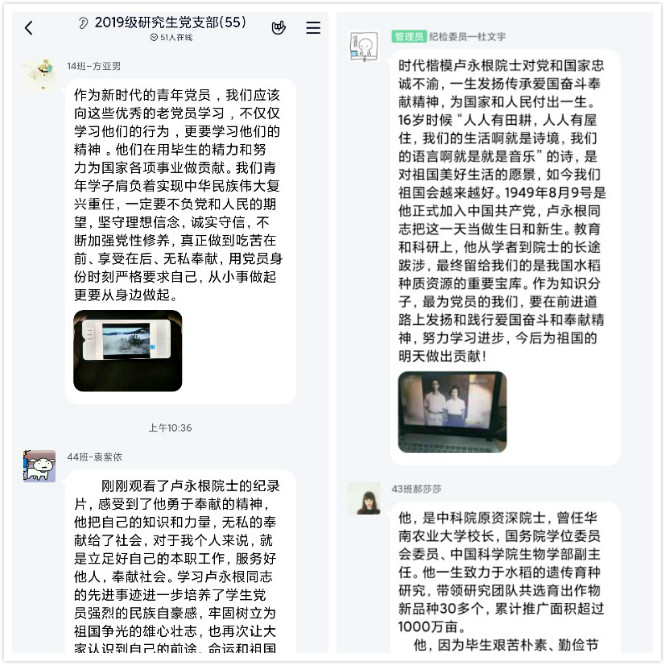 材料化学支部各位老师充分利用网络资源,追寻“时代楷模”卢永根同志勤俭爱国的一生。通过学习,支部党员了解到卢永根同志对科学实事求是,学风严谨,他长期从事作物遗传学的教学和研究工作,保存了华南地区富有特色的野生水稻基因库。卢永根同志生活简朴,淡泊名利,关爱年轻学子。他将毕生积蓄880万余元无偿捐献给华农,设立了教育基金,用于奖励贫困学生与优秀青年教师。卢永根同志还办理了遗体捐献卡,将遗体无偿地捐献给医学科研和医学教育事业。他说,作为共产党员,捐献遗体是为党和国家最后一次做出自己的贡献。