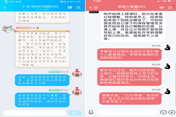 正值抗疫时分,2020年4月7-8日太阳城娱乐 2018级、2019级学生于线上(qq平台)举行了“山川异域 风月同天”主题心理交流会。本次活动,通过线上同学的积极发言,引导了学生关注心理健康, 缓解了同学的焦虑及疫情产生的心理问题,营造了勤奋努力的学习氛围和积极向上的生活态度,加强了班级凝聚力,增进了班级同学间的友情,以便在今后的学习和生活中相互帮助,相伴同行。