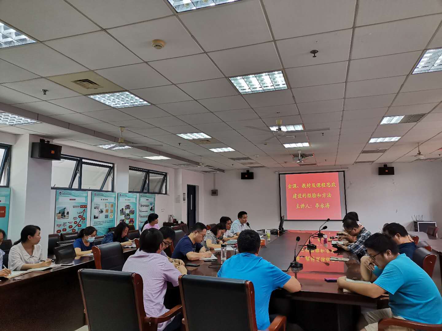 随后,李处长开展了题为“金课、教材、课程思政建设交流与汇报”的讲座,分享了一流课程建设、重点教材建设及课程思政建设三个方面的经验做法。一流课程与一流专业相依托,建设省品牌专业,同时申报国家一流专业和省一流专业作为一流课程的重要支撑。李处长在报告中介绍了金课建设的内涵,课程是由各个环节构成的,对于金课来说,每个环节都需要高要求,需要“金部件”,包括:金教材、金课程、金案例、金实验,这些重要的部件构成一个有机的整体——金项链,再进一步就是课程群里的各个课程构成一个有机的整体,发挥更大的作用。同时,李处长也阐明了线下一流课程的遴选原则,扶优(优质教学团队)、扶强(强势学科基础)、扶特(特色专业课程)、扶需(国家发展急需),这为学院申报一流课程指明了方向。在重点教材建设方面,根据“十三五”江苏省高等学校重点教材建设实施方案(修订版)文件精神,本科高校教材建设作为高校学科专业建设、教学质量、人才培养的重要内容,纳入“双一流”建设和考核的重要指标。在课程思政建设方面,李处长指出需要全面推进课程思政建设是落实立德树人根本任务的战略举措,培养什么人、怎样培养人、为谁培养人是教育的根本问题,立德树人成效是检验高校一切工作的根本标准。立志探索形成体系化、可推广的“课程思政”教育教学改革标志性成果,构建具有特色鲜明、实效性强的课程思政育人模式。