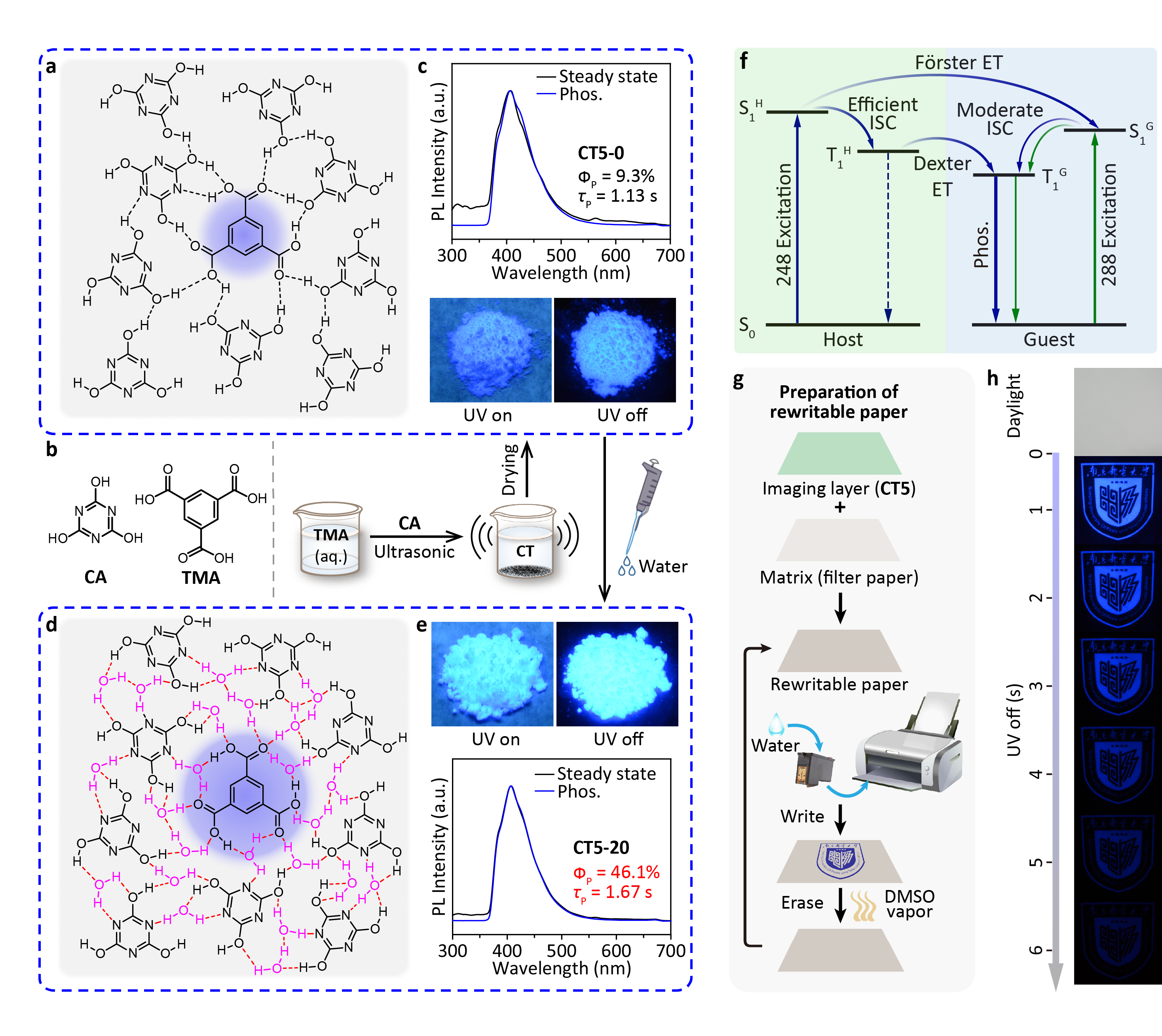 鉴于该类材料非凡的水响应长余辉性能,他们开发出用于防伪的寿命加密可复写纸。使用纯水作为墨水,可通过商用喷墨打印机打印任何高分辨率图案,加密的图案仅在移除激发源后才可见。打印的图案稳定性极佳(> 1个月),并可通过二甲基亚砜蒸汽对图案进行擦除,擦写重复性优异。这种主体敏化/水固化策略在设计同时兼具高效率、高亮度和长寿命的蓝光/深蓝光有机长余辉材料方面展现出广阔的前景,推动具有刺激响应磷光特性的创新应用的开发。