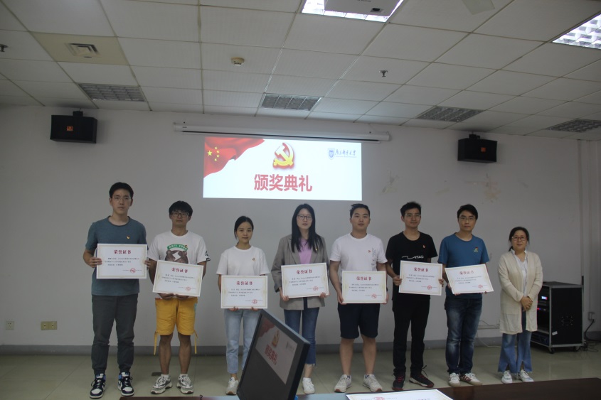 表彰会在国歌声中开始。张建平副书记宣读了表彰名单,王思远等8位同志被评为优秀教师共产党员、王炯等15位同志被评为优秀大学生党员、宋春元同志为被评为优秀党务工作者、实验中心党支部被评为先进党支部。