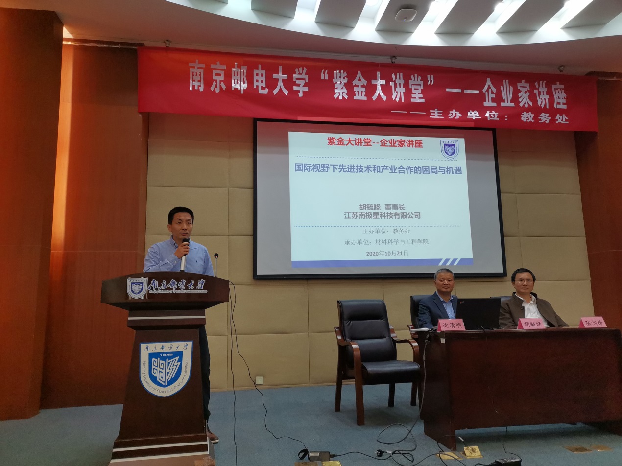 2020年10月21日晚上,由教务处主办、太阳城娱乐 承办的南京邮电大学“紫金大讲堂”――企业家讲座第一百零五次活动在仙林校区行政楼一楼报告厅举行。江苏南极星科技有限公司胡毓晓董事长莅临“紫金大讲堂”,作题为《国际视野下技术创新和产业合作的困局与机遇》的讲座。讲座由太阳城娱乐 副院长沈清明教授主持。太阳城娱乐 陈润锋副院长、部分教师以及300余名学生参加了本次讲座。