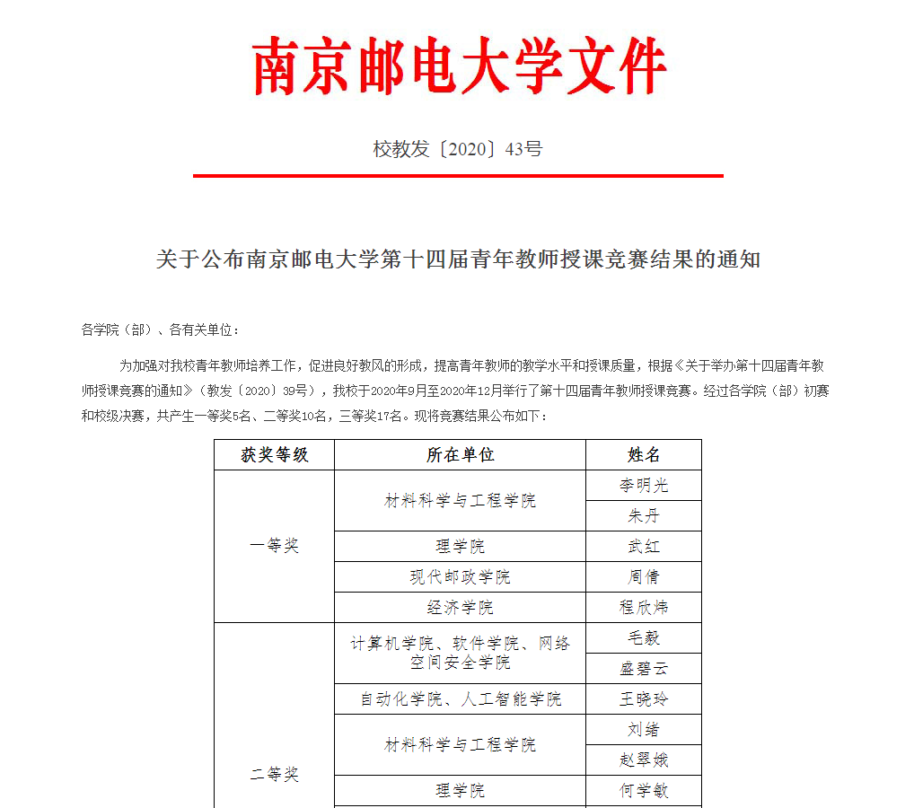 12月2日下午,由南京邮电大学教务处教师发展中心主办的第十四届青年教师授课竞赛决赛在教学2号楼举行。太阳城娱乐在线真人视讯平台 共有4位教师进入校级决赛,经过激烈角逐,朱丹和李明光老师荣获一等奖、刘绪和赵翠娥老师荣获二等奖,该成绩创造了太阳城娱乐在线真人视讯平台 教师在校级教学赛事上的最好成绩,也实现了太阳城娱乐在线真人视讯平台 在校级青年教师授课竞赛中一等奖零的突破。