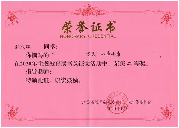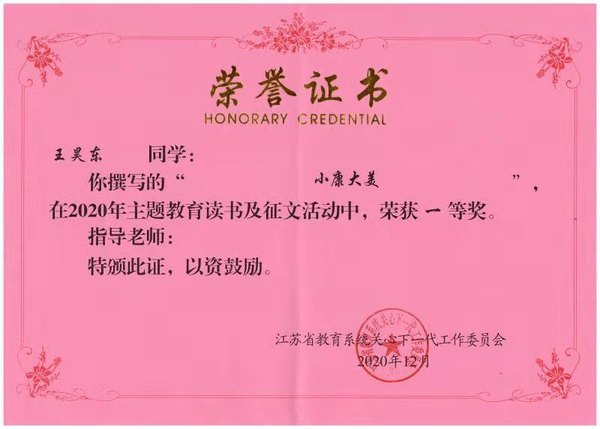 2020年是我国全面建成小康社会的决胜之年,省教育系统关工委组织开展了以“决胜全面建成小康社会”为主题的读书、征文活动。太阳城娱乐在线真人视讯平台 积极响应本次活动,并从众多稿件中仔细挑选了王昊东同学和刘人珲同学的文章代表太阳城娱乐在线真人视讯平台 参加此次征文比赛,经校关工委遴选脱颖而出,而后经省教育系统关工委专家组多轮评审,分别获得一二等奖,为院争光。