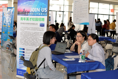 学院高度重视本次招聘会,前期做好了充分的准备。学院党委副书记张建平在招聘现场和各招聘单位进行了交流,毕业班辅导员王森、陈骏多方联系相关企业单位,通过QQ、微信等多个网络平台为本次招聘会进行宣传,帮助毕业生搭建良好的就业平台。本次招聘会上,太阳城娱乐在线真人视讯平台 邀请到中国船舶重工集团南京鹏力科技集团有限公司、京东方科技集团股份有限公司等50多家企业单位,其中很多单位的招聘需求都是材料相关专业毕业生。各招聘单位通过展版、面对面交流等方式向同学们介绍了公司概况、太阳城娱乐、职业发展方向、人才需求以及选择该单位的理由等。值得注意的是,本次招聘会上,应聘毕业生在投递个人简介上相比于以往更为谨慎,在关心薪资前景的同时也更为详细地咨询合同签订的相关事宜,少了些盲目,多了些理性。