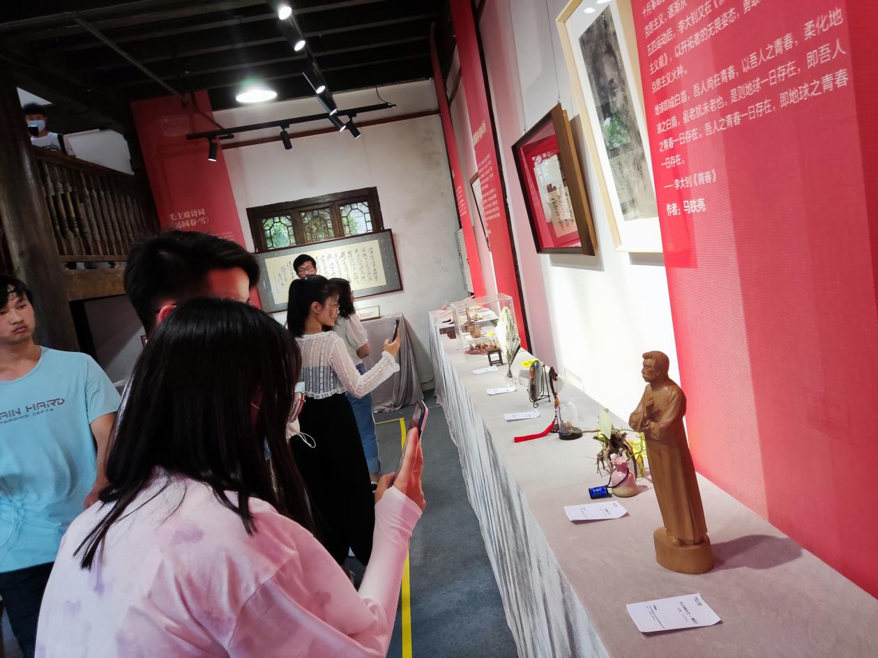 在主题展览馆内,有着包括书法、绘画、雕塑、竹刻、刺绣、紫砂、剪纸等50多类200余件作品,共分为“青春向党”“青年百匠”“青艺砂心”“青春之歌”“公益售卖”五个展区。秋收起义、古田会议、开国大典等画作让我们重温了革命的艰苦岁月;毛泽东、李大钊的画像让我们重新感受到了伟人的风采;一片树叶上勾勒的天安门风景,一块石头上雕刻的党徽,一块金箔上刻印的共产党宣言,一个蛋壳上雕刻的周恩来画像......一件件来自新兴青年群体中的非遗传人、全国技术能手、江苏省乡土人才创作的作品不仅充分展现了中国共产党的百年光辉历史、伟大成就,更让我们感受到了新兴青年群体爱党爱国、不忘初心的坚定信念,一心向党、奋发有为的青春风采。