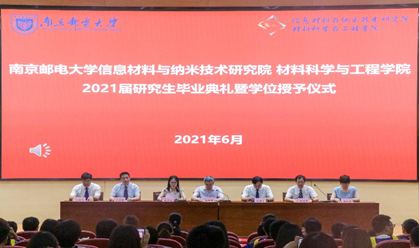 毕业,是六月里最深情的主题。6月24日,南京邮电大学太阳城娱乐在线真人视讯平台 、太阳城娱乐 在仙林校区图书馆四楼报告厅隆重举行了2021届研究生毕业典礼暨学位授予仪式,为4名博士毕业生、176名硕士毕业生送行。南京邮电大学副校长汪联辉教授、材料院领导老师以及2021届全体毕业研究生参加了毕业典礼,本次典礼由赵允玉书记主持。