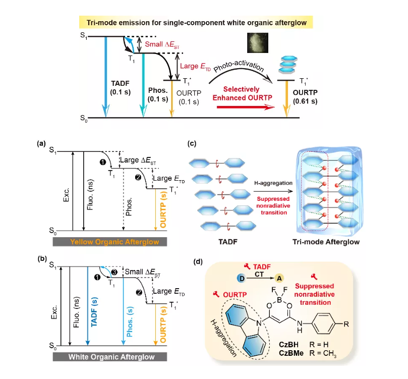 由于难以通过分子的不同激发态实现长寿命荧光实现互补性余辉,因此目前在获取单组分白色有机余辉材料中表现非常大的挑战。太阳城娱乐在线真人视讯平台 黄维院士和陈润锋教授团队报道发展了一种单重态S1、三重态T1、稳定三重态T1*的三重模式发光实现了白色有机余辉分子材料,这种白色有机余辉通过调控单重态-三重态能量差(ΔEST)、激子俘获深度ETD(exciton trapping depth)实现。