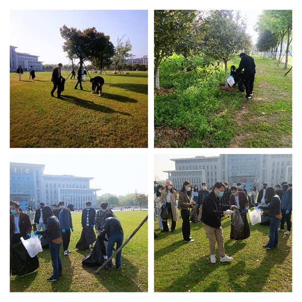 随后,党员志愿者分成四组,带上手套和垃圾袋,老师和同学们一起开始捡拾垃圾。同学们充分发挥了不怕脏、不怕累的精神,认真细致的捡拾着每一件垃圾,大到饭盒、奶茶杯,小到一团纸、一个烟头,草坪卫生得到了明显改善。在一个小时的时间内,大家共捡拾了八大袋垃圾,不仅为广大同学们提供了一个更加清洁的草坪,也向大家传递了环境保护理念,彰显了支部党员吃苦耐劳、无私奉献的精神。