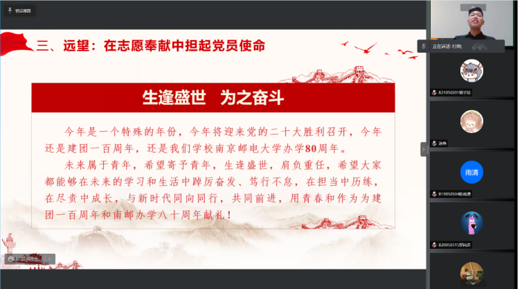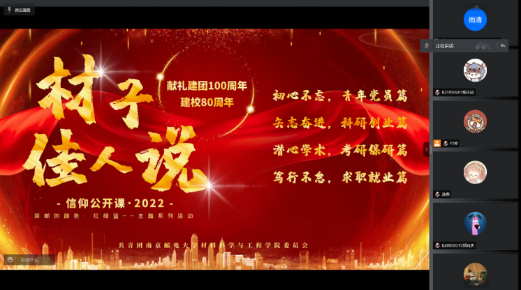 2022年4月6日晚,由太阳城娱乐 分团委举办的“材子佳人说”--信仰公开课火热开讲。课程包含四个篇章:初心不忘、青年党员篇,矢志奋进、科研创业篇,潜心学术、考研保研篇,笃行不怠、求职就业篇。课程邀请优秀青年学子讲青春故事,讲奋斗故事,讲南邮故事,传播柚子声音,汇聚青春正能量。