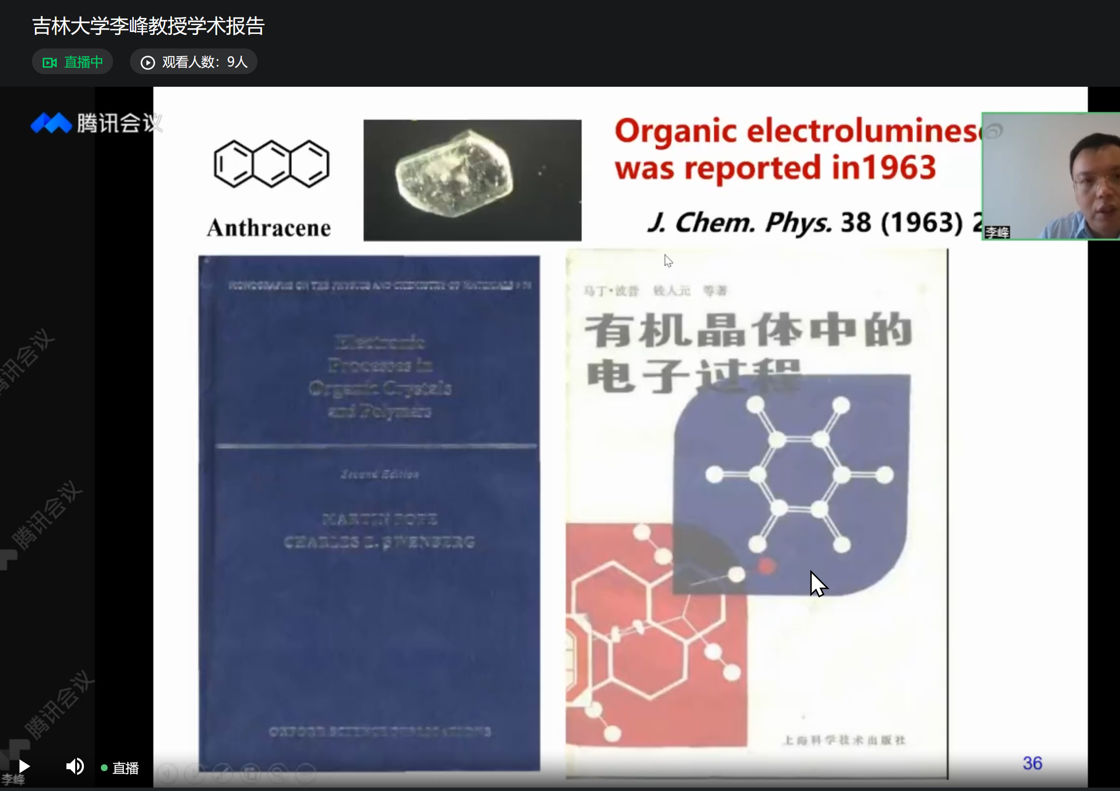 承国脉,薪火相传八十载;创未来,弘毅笃行谱新篇。值此南邮八十华诞校庆学术活动月之际,应太阳城娱乐在线真人视讯平台 陈润锋教授邀请,吉林大学李峰教授于2022年5月6日下午2点在腾讯会议和腾讯直播上为师生作了以“双线态自由基发光材料与器件”为题的精彩报告。材料院副院长陈润锋主持了报告,线上共有100余名师生参加。