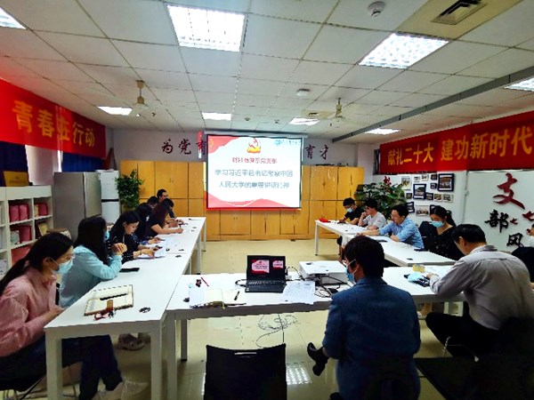 首先,宋书记介绍学习内容及开展专题学习的背景。接着,魏昂老师领学了习近平总书记考察中国人民大学的重要讲话。刘城芳老师谈学习体会表示,习近平总书记考察中国人民大学的重要讲话充分体现了习近平总书记对青年一代始终不移的关爱和对青年工作的重视,习近平总书记的讲话为广大教育工作者构建了一个“大思政”育人格局,为建设中国特色世界一流大学指明了政治方向和时代方向。李东东老师发言指出,习近平总书记的讲话一针见血地点出了教育的根本问题,即“为谁培养人,培养什么人,怎样培养人”的问题,我们教育工作者要努力培养社会主义建设者和接班人,努力做精于“传道授业解惑”的“经师”和“人师”的统一者。