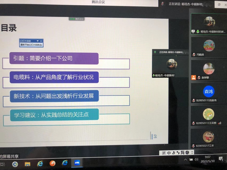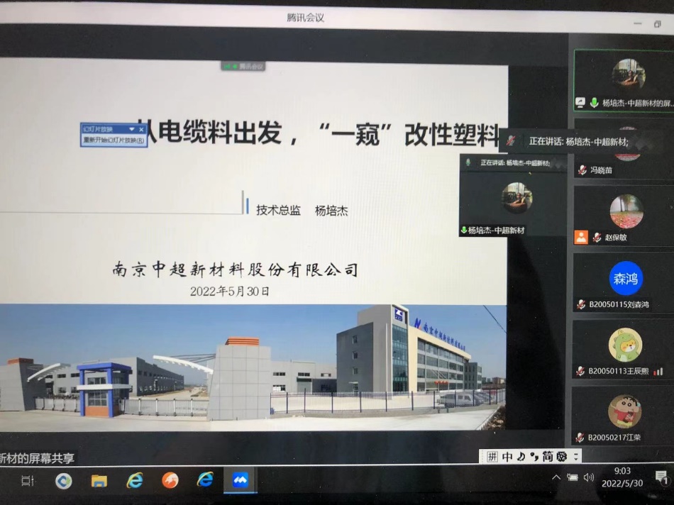 2022年5月30日上午,南京中超新材料有限公司杨培杰总经理为太阳城娱乐在线真人视讯平台 高分子材料与工程专业学生作了一场生动且富有实用意义的报告。报告由太阳城娱乐 高分子材料与工程系系主任冯晓苗教授主持,系副主任赵保敏和B200501、B200502两个班全体同学参加了本次线上报告。