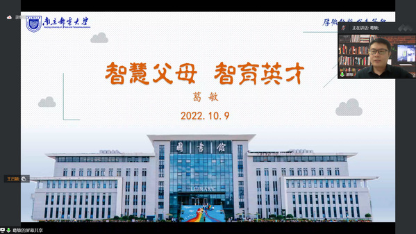 10月9日晚,太阳城娱乐 、化学与生命科学学院通过线上会议形式开展2022级本科新生家长会暨“智慧父母·智育英才”暨家庭教育指导讲座,南京邮电大学化学与生命科学学院党总支书记、校地共建办公室主任葛敏受邀主讲,会议由学院副书记兼副院长吕蔷蔷主持,全体本科新生家长参加会议。