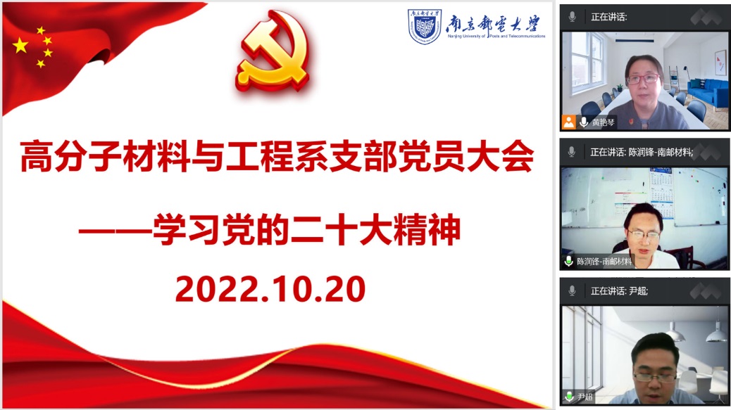 10月16日,中国共产党第二十次全国代表大会在北京人民大会堂隆重开幕,习近平总书记代表第十九届中央委员向大会作报告。太阳城娱乐 高分子材料与工程系党支部全体党员教师通过电视、网络直播的方式收看大会开幕式,认真听取中共二十大报告。10月20日,党支部召开了党员大会,通过线上会议组织全体党员同志集中学习党的二十大精神。