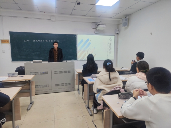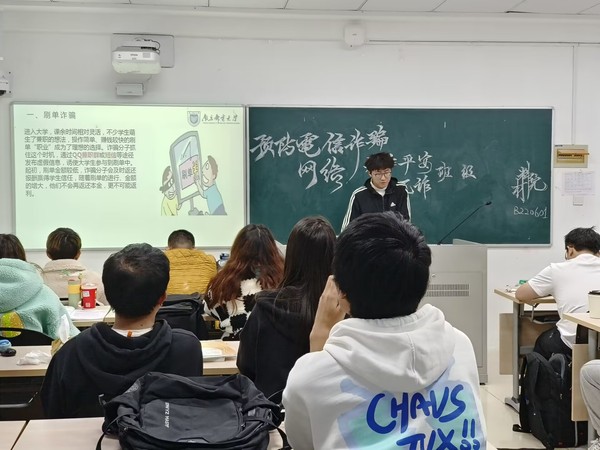 B220604冯凯同学首先介绍了几种常见的诈骗手段以及同学们可能遇到的情况,播放了相关视频,让同学们意识到了预防电信诈骗的重要性。台下的同学们积极发言,发表各自的看法。随后,冯凯介绍了几个防范诈骗的技巧,以期进一步提高防诈骗意识。