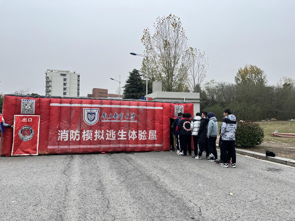 在消防协会志愿者的引导下,2022级新生分批次进入消防模拟逃生体验屋体验火场逃生,然后体验灭火器的正确操作与使用技巧。