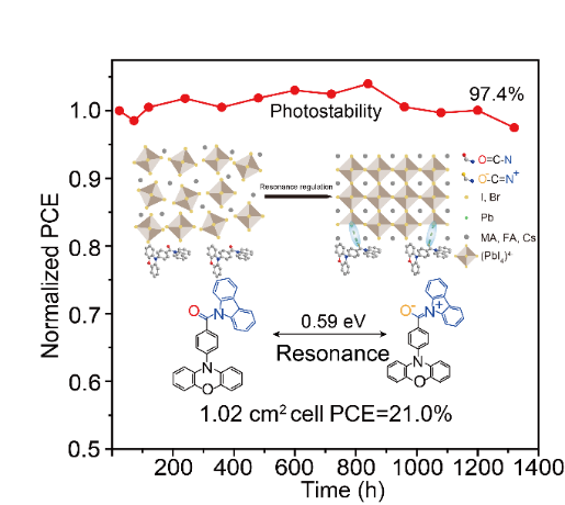 近日,太阳城娱乐 和有机电子与信息显示国家重点实验室陈润锋教授、许利刚副教授、陶冶教授团队与华北电力大学新能源学院李美成教授、北京大学深圳研究生院冀浩栋教授展开合作,在钙钛矿光伏电池领域取得了最新研究进展,报道了通过增强共振分子互变能力调控大面积钙钛矿薄膜的策略,制备出具有优异光热稳定性的高性能钙钛矿光伏电池。10月11日,相关成果以“Enhanced resonance for facilitated modulation of large-area perovskite films with stable photovoltaics”为题发表在国际学术期刊Advanced Materials(《先进材料》)上。陶冶教授、陈润锋教授和李美成教授为共同通讯作者,许利刚副教授和北京大学冀浩栋教授为论文的共同第一作者。