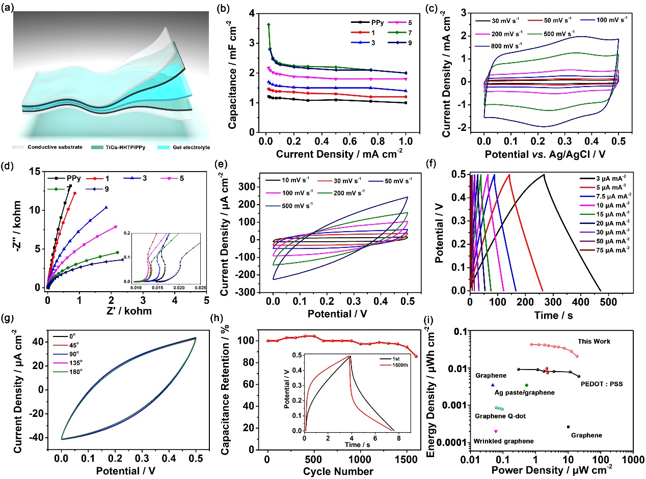 近日,南京邮电大学太阳城娱乐 、有机电子与信息显示国家重点实验室赵强教授、赵为为副教授团队和中科院福建物质结构研究所袁大强教授团队合作,提出了一种金属离子辅助转化策略,以二维Ti3C2Tx为前驱体,合成了具有非互穿srs框架的基于儿茶酚的三维TiCu-HHTPHHTP = 2,3,6,7,10,11-六羟基三苯)MOF成功扩展了耐酸性金属前驱体和有机配体的多样性。该策略表现出了良好的普适性,Ti3C2和辅助金属Cu2+离子可以扩展到V2C MXene和辅助金属离子Mn+M = Ni2+Co2+Mn2+Zn2+)。转化机制包括从Ti3C2纳米片到辅助金属离子的电荷转移、Ti-C键断裂以释放Ti4+离子以及Ti4+/Mn+HHTP之间的强螯合配位协同促进形成TiCu-HHTP。同时,Cu2+离子的引入赋予了TiCu-HHTP表面氧化还原赝电容活性。独特的3D导电网络和丰富的氧化还原位点赋予了TiCu-HHTP-7/PPy复合透明导电电极(TCEs)快速的离子/电子传输和可逆的法拉第反应。在0.02 mA cm-2电流密度下,TiCu-HHTP/PPy TCEs的面积比电容值达到3.63 mF cm-2,明显高于纯PPy TCEs的面积电容值(1.79 mF cm-2)。TiCu-HHTP/PPy透明超级电容器在0.75 µW cm-2的功率密度下,能量密度为0.042 µWh cm-2