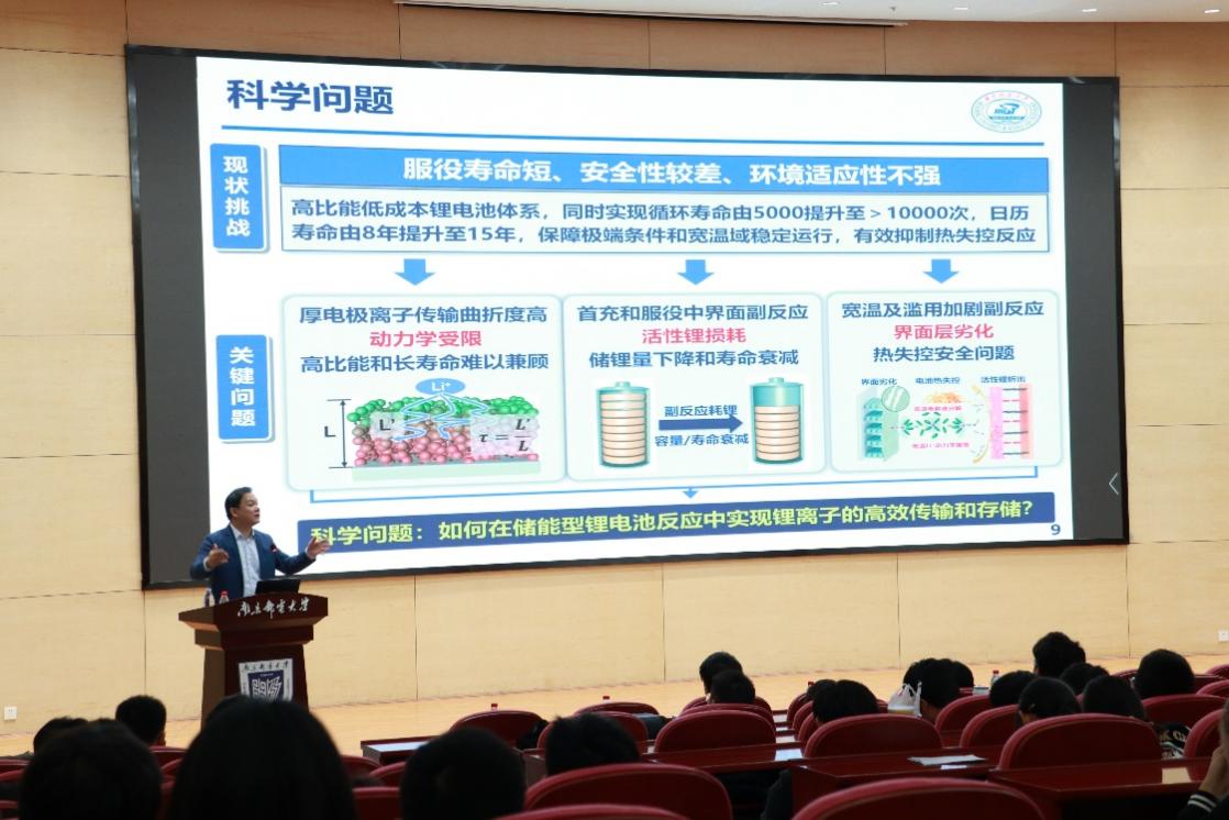 2023年10月26日上午,太阳城娱乐 在图书馆四楼报告厅成功举办了第四期主旨为“新时代、新青年、新材料、新能源、新前沿”的“五新”讲坛。此次讲坛的主讲嘉宾为华中科技大学电气与电子工程学院谢佳教授,讲坛的主题为规模化锂离子电池储能关键技术。新能源材料与器件专业的全体学生和部分专业骨干老师及研究生参加了本次讲坛,本次讲坛由新能源材料与器件系主任黄镇东教授主持。