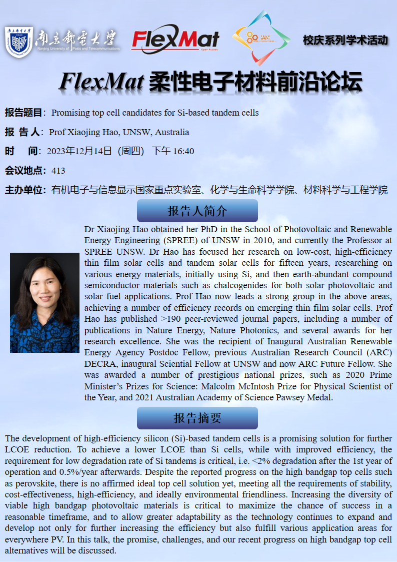 FlexMat柔性电子材料前沿论坛: 新南威尔士大学 郝晓静教授