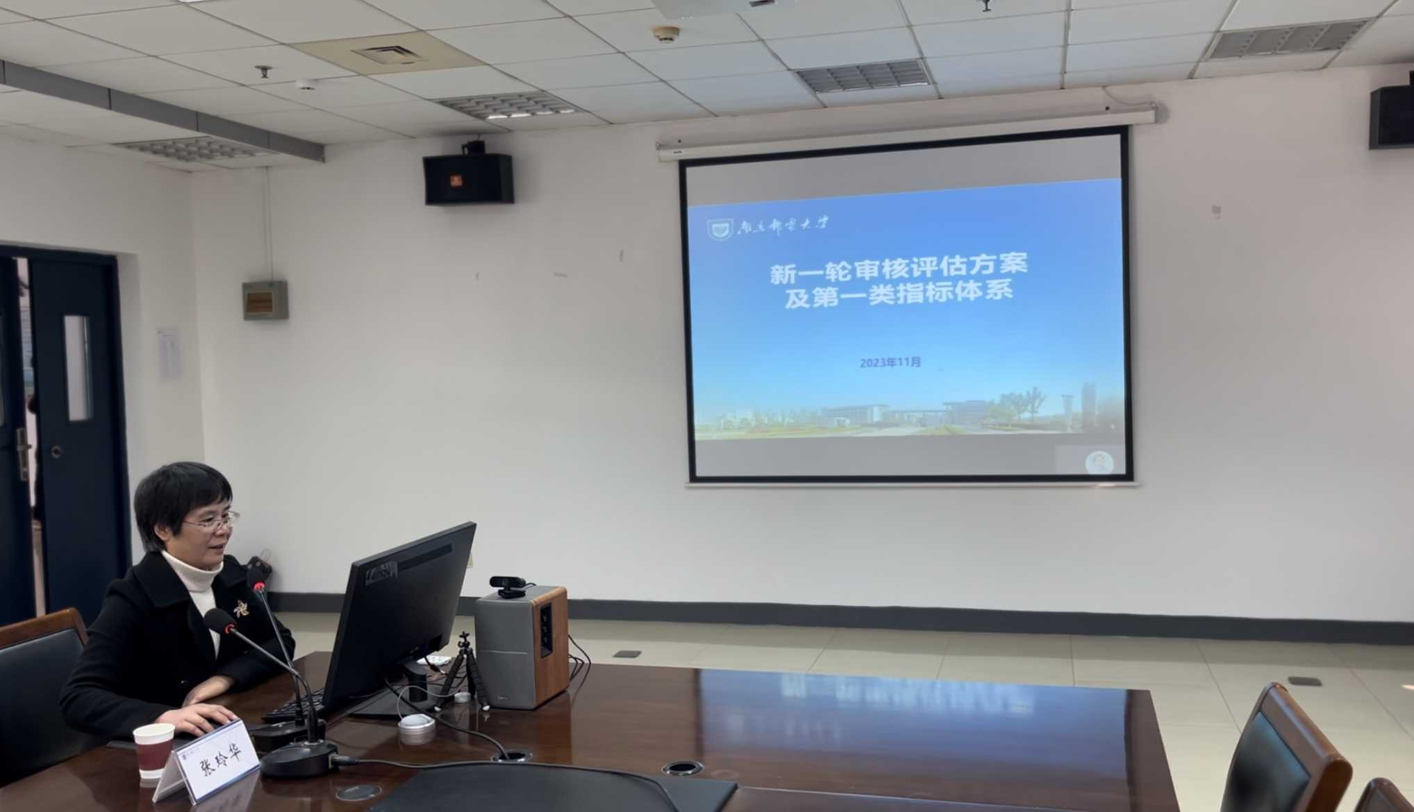 张玲华教授首先讲到,对待本科教育教学审核评估工作,全院教师要提高认识,实现人人参与的良好氛围。随后她从新一轮审核评估的基本原则、工作目标和重点问题三个方面进行了介绍,并指出了指标体系对自评报告撰写的引领作用,对新一轮审核评估的12个二级指标的内涵进行了详细解读。张玲华教授强调,在院级自评报告撰写过程中,凝练总结学院办学特色是关键。