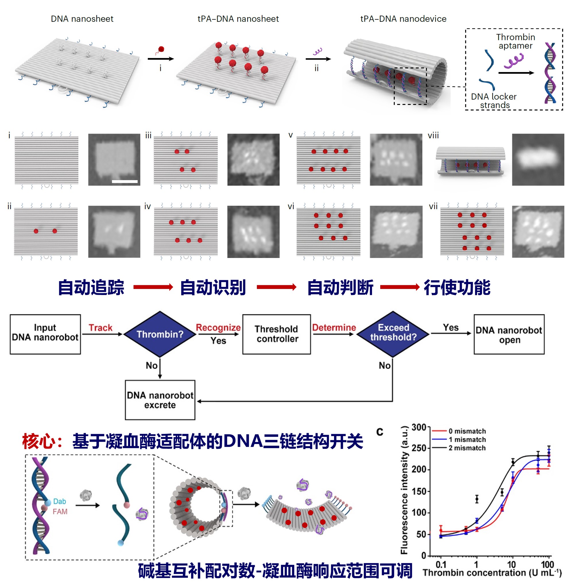 1959年著名物理学家费曼曾预言“可吞下的外科医生”,设想了可注射的微型机器在医学中的应用。DNA纳米技术以人体的四种碱基为基本单元,精确构筑功能模块并通过有序自组装可实现自动执行系列任务的纳米机器。近日,南京邮电大学汪联辉教授、晁洁教授和高宇副教授带领科研团队开发了一种智能DNA溶栓纳米机器,可在血管内复杂病生理环境下识别血栓的生物标志物凝血酶,并通过针对凝血酶浓度的逻辑运算区分血栓和伤口凝块,实现靶向血栓的精准给药,相关工作以“An intelligent DNA nanodevice for precision thrombolysis”为题发表在Nature Materials期刊。