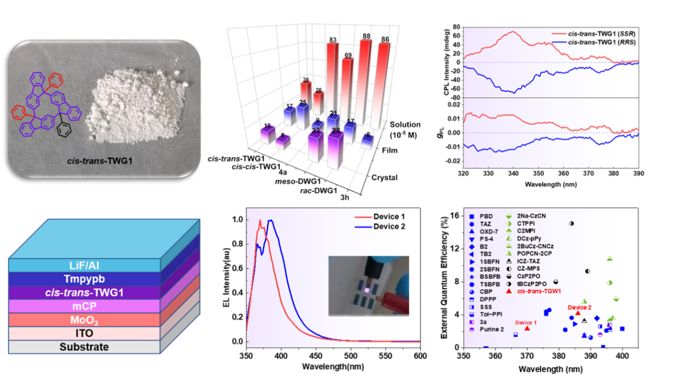 图二、三角风车格类有机纳米烃的物质形态、圆偏振发光行为以及UV OLED