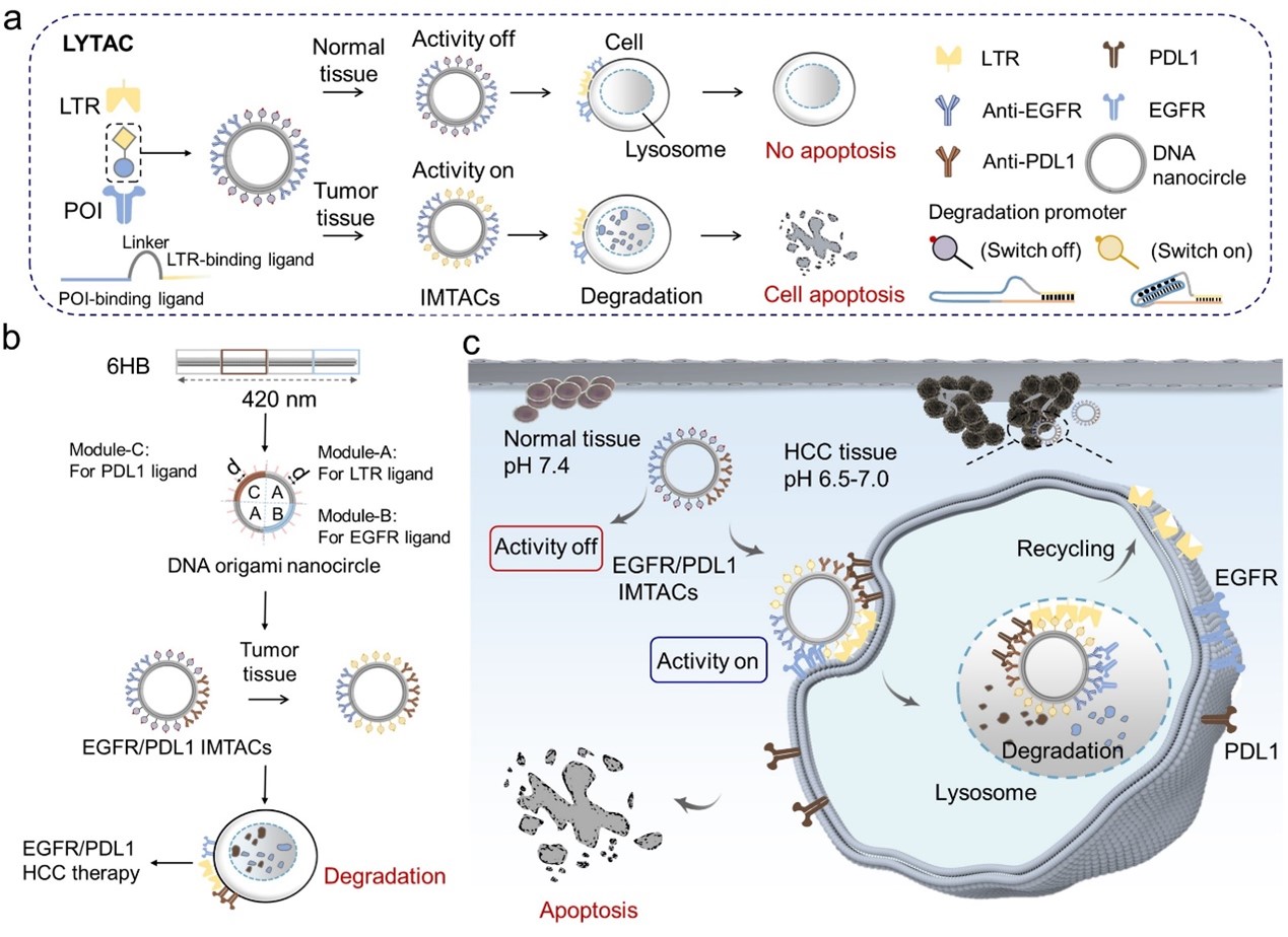 为了实现这一目标,汪联辉教授、晁洁教授带领的团队设计了一种可编码DNA纳米平台,利用智能模块化DNA LYTACsIMTACs)纳米器件,在肿瘤微酸环境中特异性降解多种致病蛋白。DNA环状折纸具有高稳定性、低免疫原性和可编程性,及近端排布等优点,满足了对不同配体的精准排布的需求,是IMTACs的理想纳米载体。通过精确控制LTRs和蛋白配体的化学计量学和模块化分布,IMTACs纳米器件能够精确定位和递送到肿瘤组织中。在肿瘤组织中,酸性肿瘤微环境触发激活降解开关,IMTACs多价结合,并有效降解各种预先指定的蛋白质。IMTACs的组织特异性和多价配体显著提高了药物利用率,同时减少了脱靶效应。重要的是,该系统显示了肿瘤组织中EGFRPDL1协同降解的能力,可用于肝细胞癌(HCC)的联合靶向和免疫治疗。此外,DNA折纸纳米结构可以结合不同类型的靶配体(适体、RNA、肽、抗体等),从而促进了新的靶蛋白降解剂的灵活设计。该研究扩大了靶向蛋白降解的范围,并为发现各种疾病的创新疗法提供了新的思路。