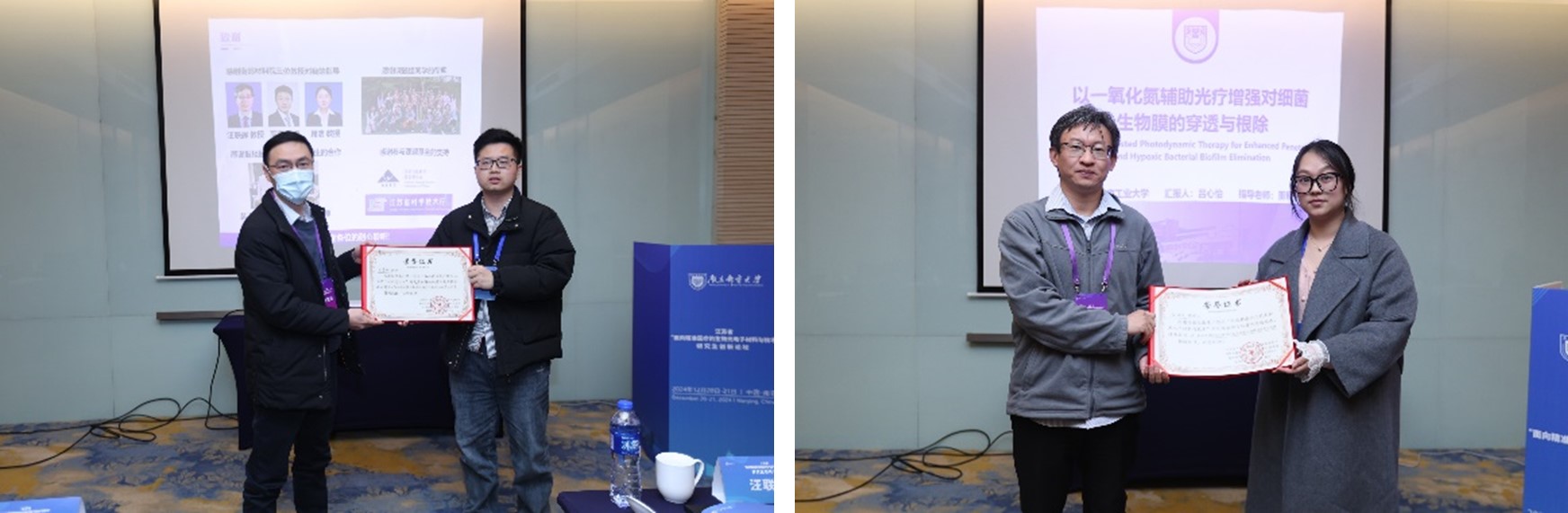 论坛各项议程由材料院教师侍茜茜老师主持。此次论坛围绕“面向精准成像与诊断的生物光电子材料与技术”和“面向精准治疗的生物光电子材料与技术”两大方向进行了学术报告。南京大学叶德举教授和南京医科大学胡本慧教授分别主持两部分的报告,并与同学们进行了探讨和交流,气氛热烈而融洽。随后,他们为每位作报告的同学颁发了荣誉证书。