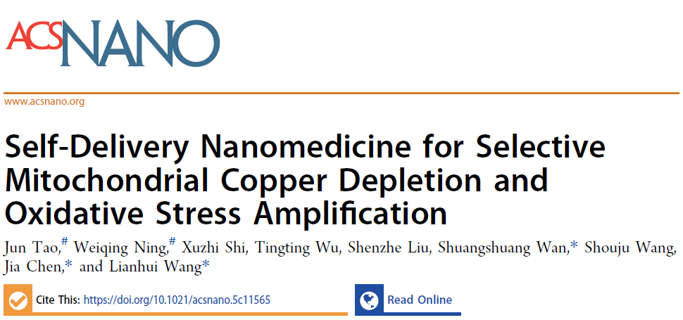 近日,南京邮电大学柔性电子全国重点实验室汪联辉教授团队在自递送纳米药物领域取得新进展。相关成果以“Self-Delivery Nanomedicine for Selective Mitochondrial Copper Depletion and Oxidative Stress Amplification”为题发表在国际学术期刊Acs Nano上。重点实验室汪联辉教授、万双双副教授及山东第一医科大学陈嘉副教授为共同通讯作者,青年教师陶俊和硕士生宁维青为论文共同第一作者。