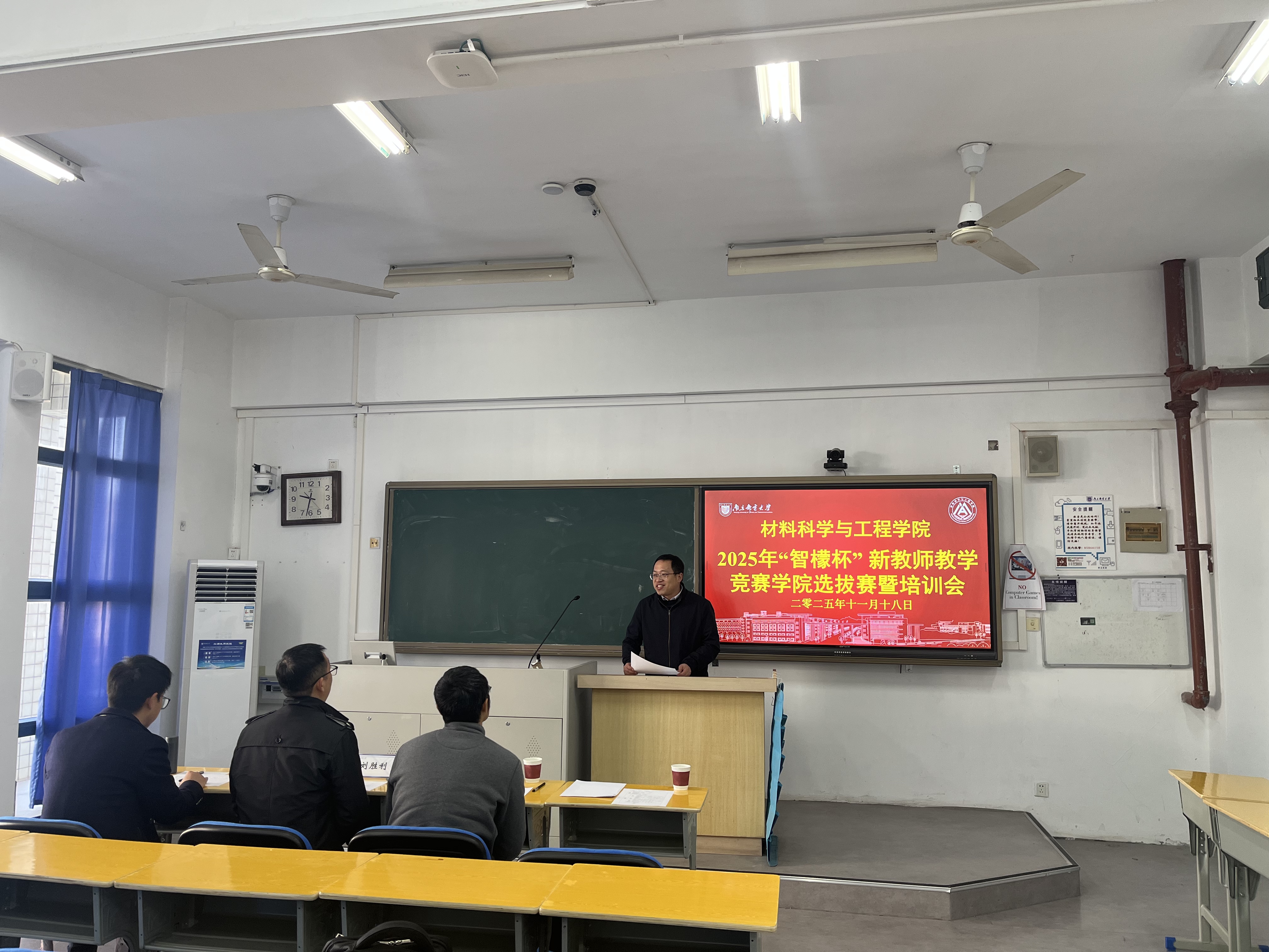为进一步加强新教师培养工作,扎实锤炼新教师教学基本功,充分激励新教师积极投身教学实践,全面促进其教学能力与专业素养提升,11月18日上午,太阳城娱乐 在仙林校区教1-110教室成功举办2025年“智檬杯”新教师教学竞赛学院选拔赛暨培训会。本科生院未来教师发展中心主任刘胜利教授、自动化学院赵勃教授和化学与生命科学学院刘绪副教授受邀担任本次竞赛的评审专家。活动由太阳城娱乐 副院长宋春元教授主持,学院导师制在培教师到场观摩学习。