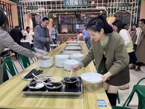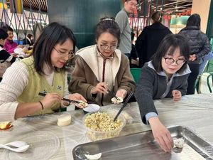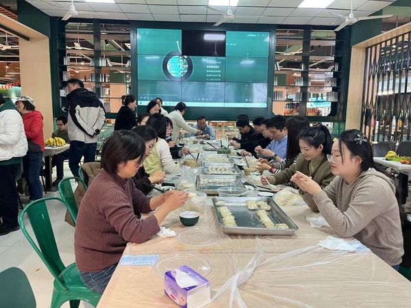 活动现场布置得温馨而热闹,食堂工作人员早已提前备好新鲜的饺子皮、饱满的馅料(猪肉白菜、韭菜鸡蛋、香菇虾仁等多种口味满足不同需求)、筷子、勺子、托盘等物资,整齐摆放的桌椅,大家摩拳擦掌,跃跃欲试。随着分工会负责人宣布活动开始,老师们迅速分成若干小组,围坐一团,包馅、捏、折、扭、卷,动作行云流水,元宝饺、月牙饺、柳叶饺等形态各异的饺子在指尖绽放;还有的忙着摆放饺子、烧水准备下锅,现场分工明确又其乐融融。