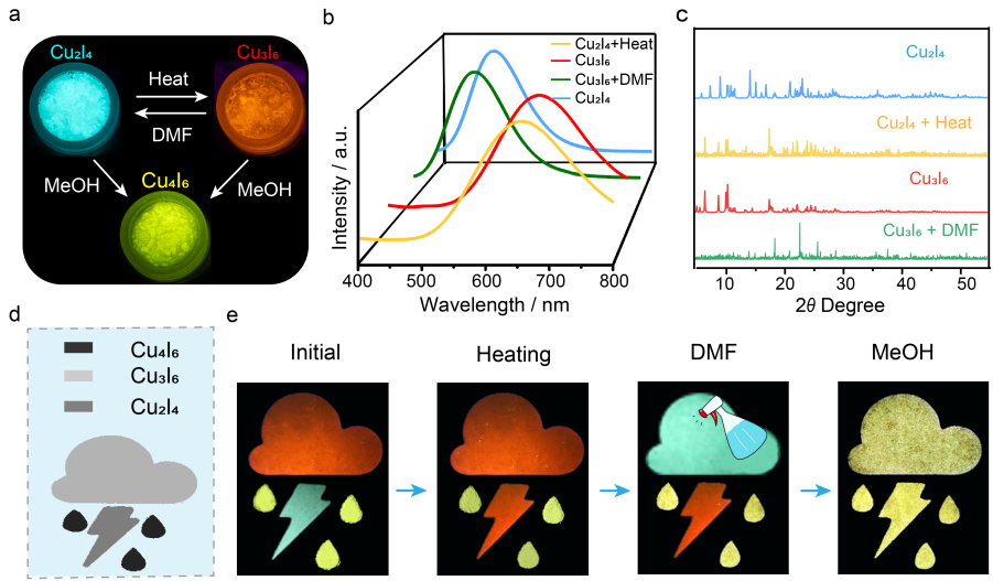 此外,该系列化合物还表现出刺激响应性相变行为:通过加热或DMF溶剂处理可触发二聚体与三聚体之间的可逆转换;甲醇处理则可将二聚体或三聚体转变为四聚体,并伴随发光颜色的切换(青光↔红光;青光/红光→黄光)。基于这一可控、顺序相变特性,成功构建了一个多级防伪演示,展示了其在信息加密与防伪领域的应用潜力。