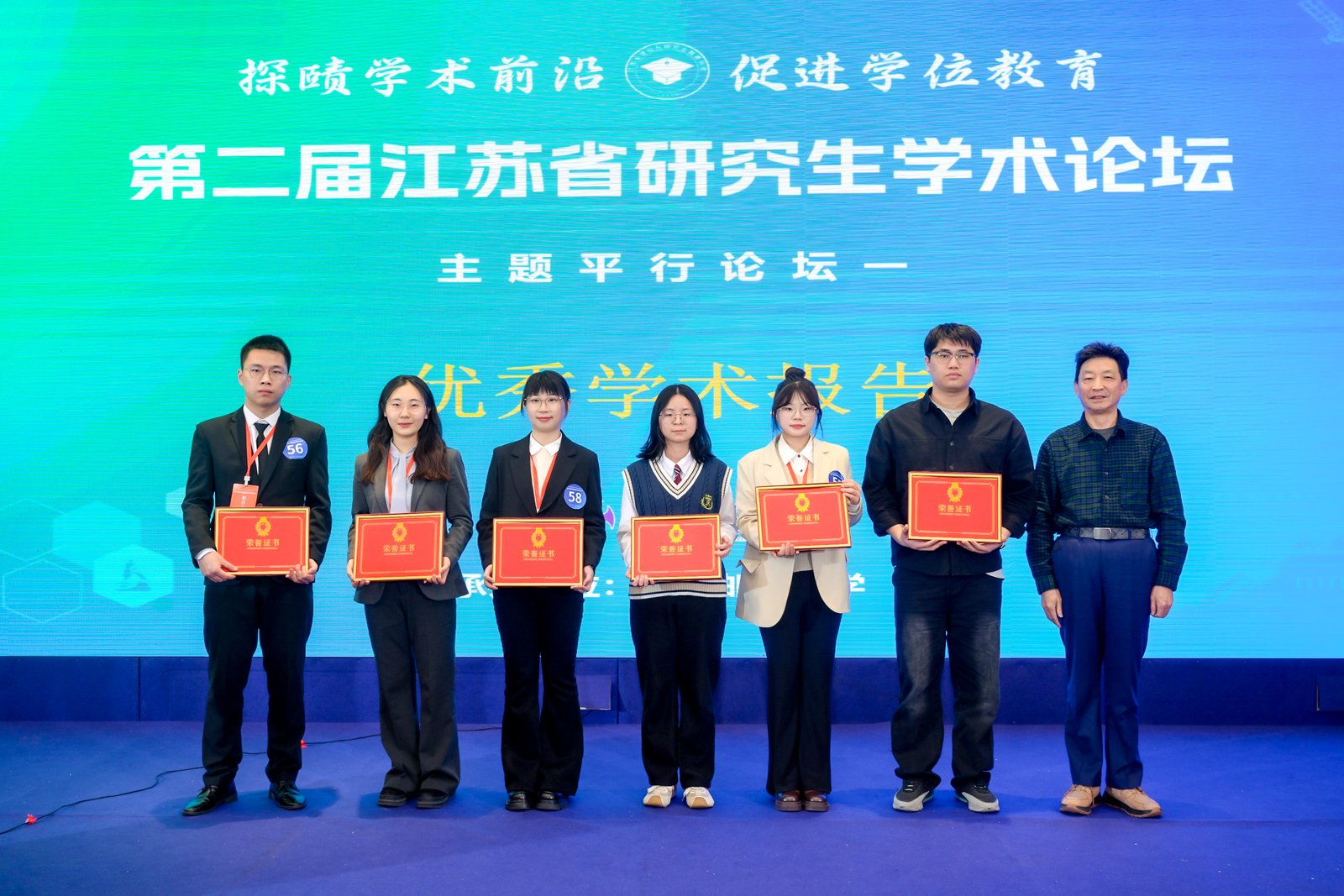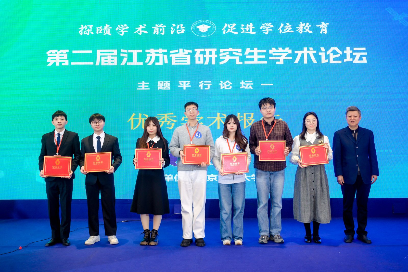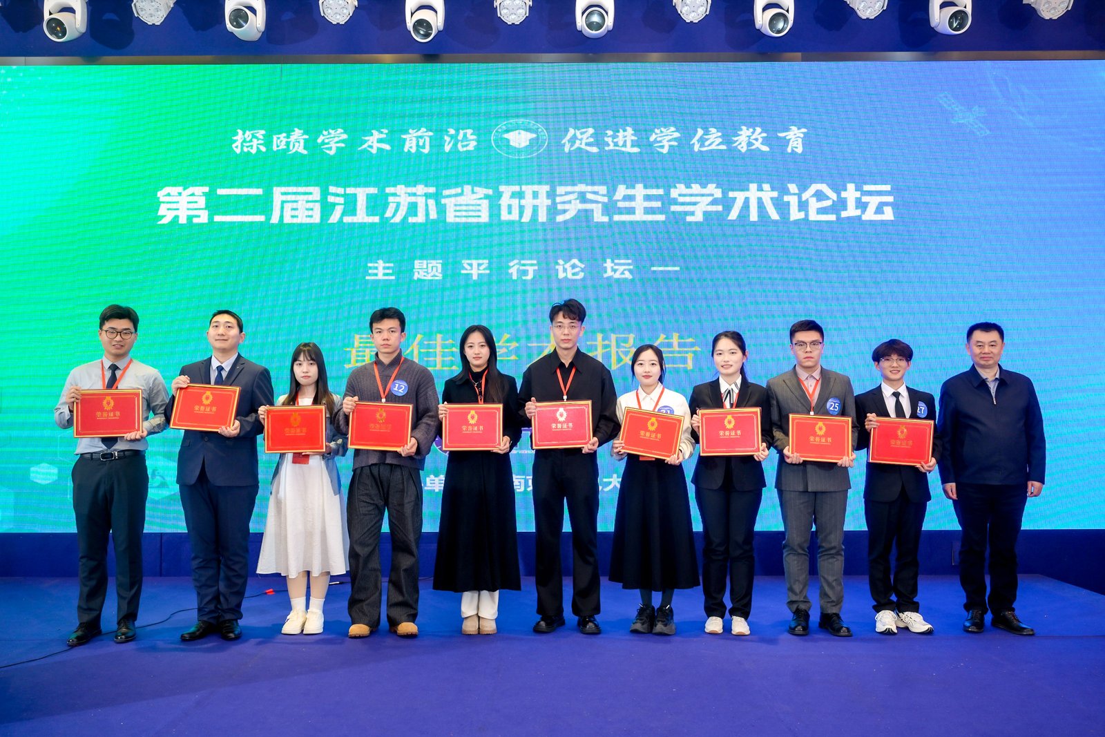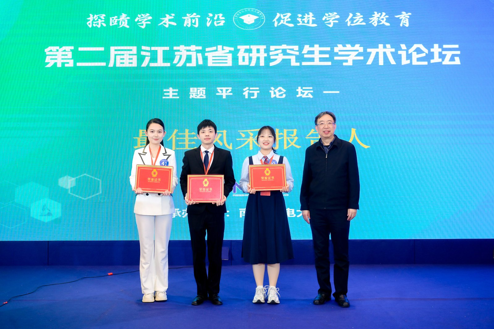 论坛评选出“最佳学术报告”“优秀学术报告”及“最佳风采报告人”等奖项,专家评委为获奖选手颁奖并合影留念。我校李子君、刘睿杰、史之然三名选手获最佳学术报告,董乐获优秀学术报告。本场论坛搭建了一个高质量的青年学者交流平台,促进了不同高校、不同学科之间的互动,也为研究生展示科研成果、锻炼表达能力和拓展学术视野提供了重要机会。