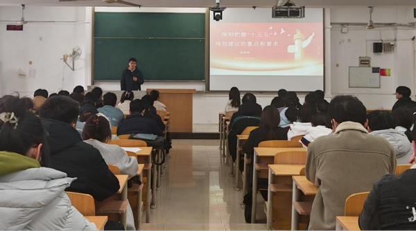 为深入学习贯彻党的二十届四中全会精神,推动“十五五”规划建议与学科科研实践深度融合,引导师生党员将个人理想融入国家发展大局,2025年12月19日,太阳城娱乐 学工党支部和博士党支部联合邀请支部指导老师、学院党委委员、副院长凌海峰教授为博士生党支部全体党员、入党积极分子以及学工党支部党员讲授“深刻把握‘十五五’规划建议的重点和要求”专题党课。